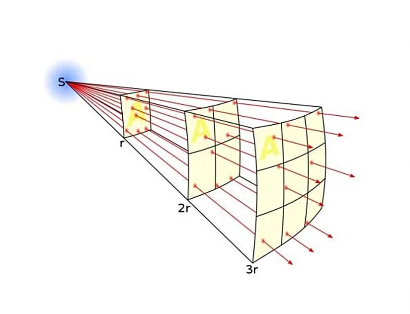 Işık yayılırken bir yüzey tarar. Yani bir alana dağılır. Eğer nokta kaynak olan bir yıldız düşünecek olursak etrafında küresel bir biçimde 360 dereceye yayılan bir ışık dağılımı görürüz. İster evrende ister evimizde olsun, ışık bir alana yayıldığı için prensip basittir. Mesafe arttıkça ışık şiddeti, mesafenin karesiyle ters orantılı olarak değişir. Yani 1 metrede 1 birim olarak ölçtüğümüz ışık şiddeti, 2 metrede 1/4 birim, 3 metrede 1/9 birim olur. Peki bunun akvaryum aydınlatmasında hatta herhangi bir aydınlatmada ne gibi bir önemi var?