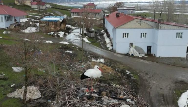 Bitlis'in Güroymak ilçesinde elektrik direğine yuva yapan leylek, 3 yıldır göç etmiyor. Köylüler, kışı köylerinde geçiren leyleğe zamanlar zaman besin bırakıyor.