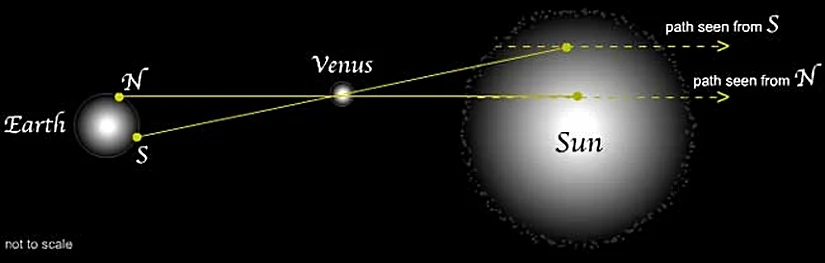 Bu metot Venüs'ün Güneş önünden geçerken Dünya'nın farklı yerlerinden aynı anda gözlemlenmesine dayanıyor. Şekilde görüldüğü gibi kuzeyden ve güneyden aynı olayı gözlemleyen iki gözlemci, Venüs'ü farklı açılardan görecek ve bu nedenle Venüs'ün güneş üzerinden geçtiği süreyi ve Güneş üzerinde kat ettiği yolu farklı ölçeceklerdir.