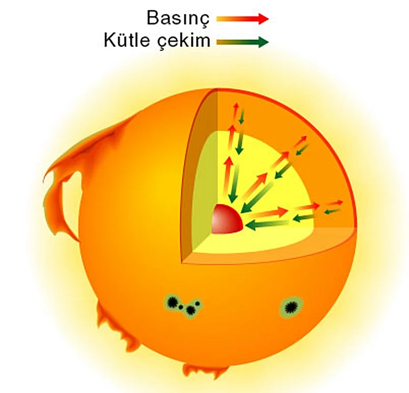 Yıldızın merkezinden belirli bir uzaklıkta bulunan, çok ince bir katmanı temsil eden küçük bir hacim parçası düşünelim. Bu parçanın kütlesi vardır ve yıldızın içindeki toplam kütle nedeniyle merkeze doğru çekilir. Bu çekim, parçayı içe doğru sıkıştırmaya çalışır.