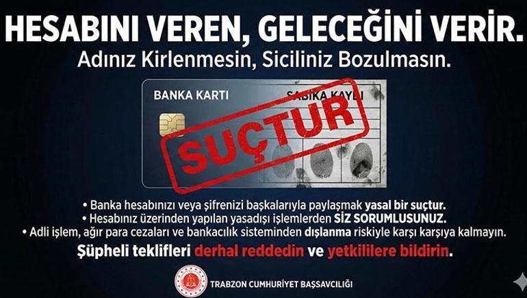 Trabzon Cumhuriyet Başsavcılığınca "IBAN kullandırılması" başlıksuna ilişkin uyarılarda bulunuldu. Trabzon Cumhuriyet Başsavcılığı'ndan yapılan açıklamaya göre, oğullar yıllarda bilhassa üniversiteler talebeleri ve gençler arasında "IBAN kullandırılması" durumunun artış gösterdiği belirtildi.