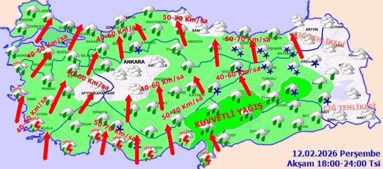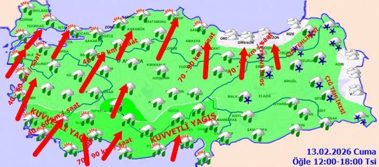 KUVVETLİ RÜZGÂR: Rüzgârın; Güney Ege ve Batı Akdeniz’de, 13.02.2026 Cuma günü günaydın saatlerinden itibaren İç Anadolu bölgesi, Batı Karadeniz’in dahili kesimleri ile Doğu Akdeniz’in Toroslar mevkiinde cenup yönlerden kuvvetli rüzgarlı ve fırtınalar (50-70 km/saat), Antalya, Isparta, Muğla, Karaman, Konya, Niğde ve Kayseri çevrelerinde mahalli olarak kuvvetli fırtınalar (50-80, mekan yer 90 km/saat) bekleniyor. Fırtınayla birlikteki ulaşımda aksamalar, dam uçması, ağaçlar devrilmesi, soba ve doğalgaz kaynaklı zehirlenmeler gibi olumsuzluklara mukabil titiz ve tedbirli olunmalıdır.