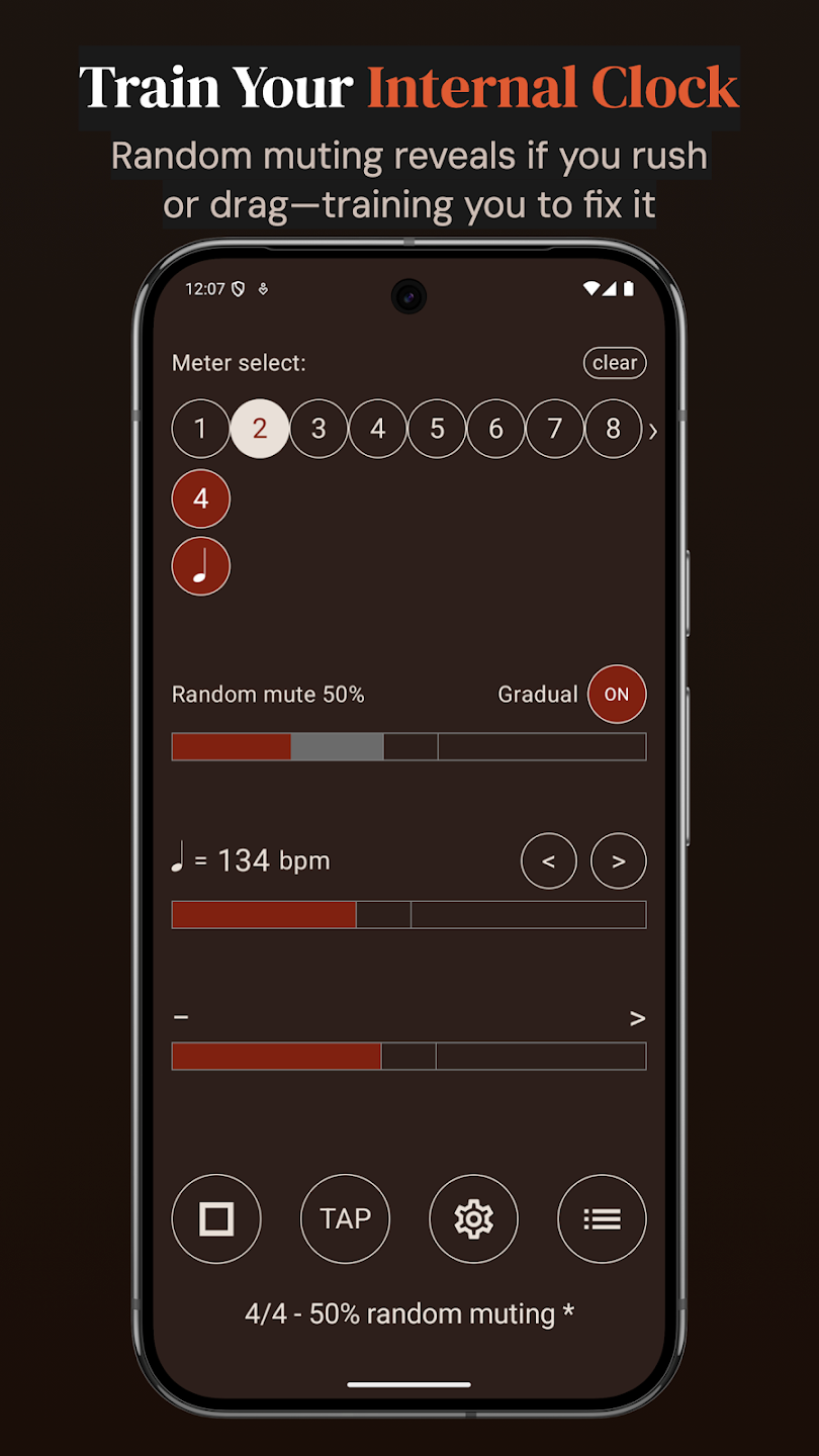 Time Guru tempo duygunuzu geliştirmek için benzersizliği tek yöntem kullanıyor. Uygulama kesin vuruşları rastgele susturarak öz iç zammanaanızı testleri etmenizi sağlıyor. Bu nedenle müzikal bağımsızlığınızı artırmak için piyasadaki en tesirli araçlardan arasında biri sayılıyor. Profesyonel eğitimciler bu yöntemi şiddetle öneri ediyor.