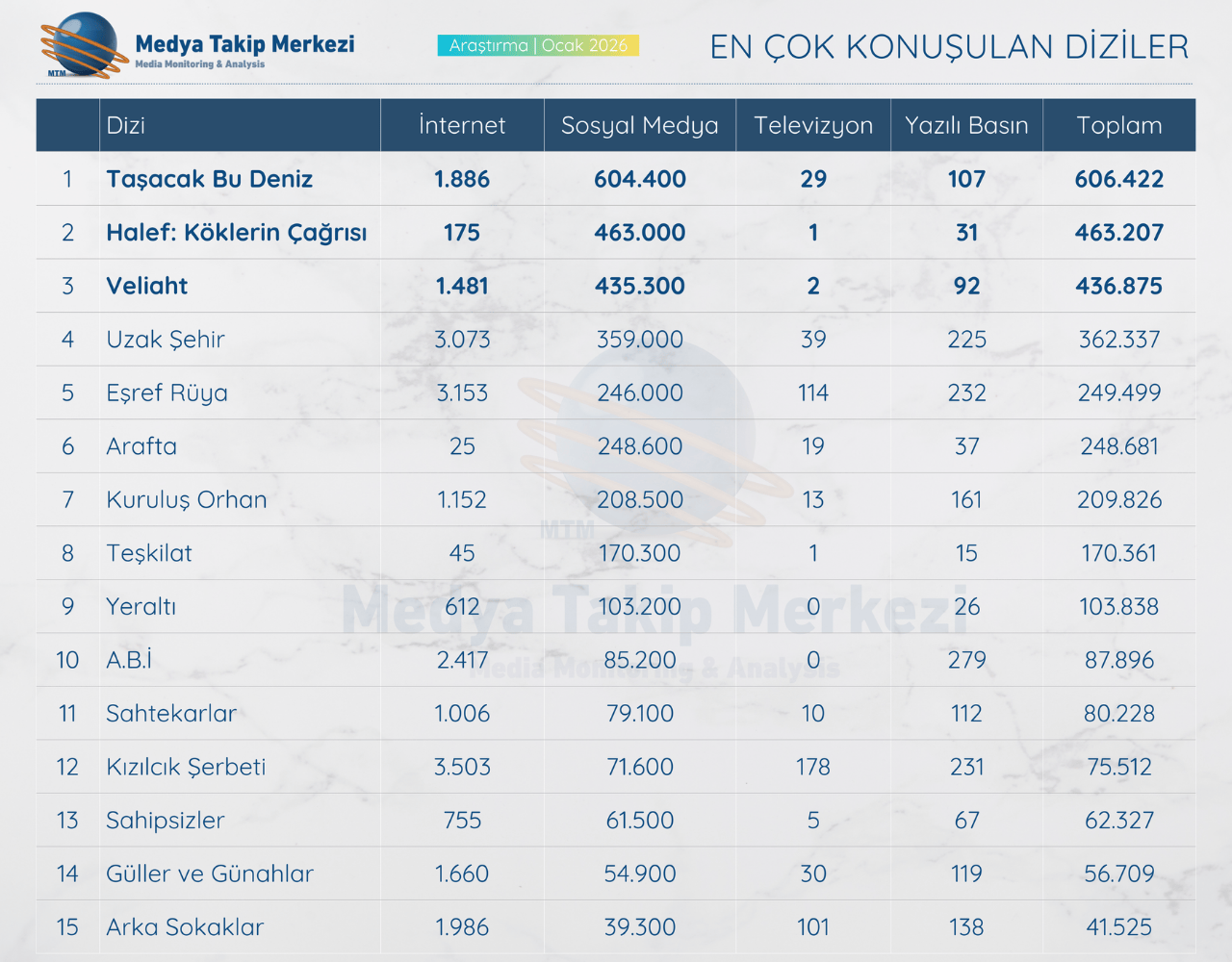 Yeni yılın ilk ayında dizi dünyasındaki rekabet, mecralara göre keskin çizgilerle ayrıldı. MTM Medya Takip Merkezi tarafından hazırlanan kapsamlı rapor; 10 bini aşkın kaynak üzerinden yapılan incelemeyle Ocak 2026’nın en popüler yapımlarını belirledi. Verilere göre dizi sektörü, Aralık ayına kıyasla sosyal medyada %15, geleneksel medyada ise %18 oranında daha fazla konuşularak görünürlüğünü artırdı.