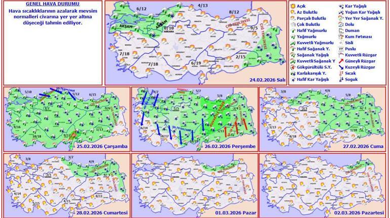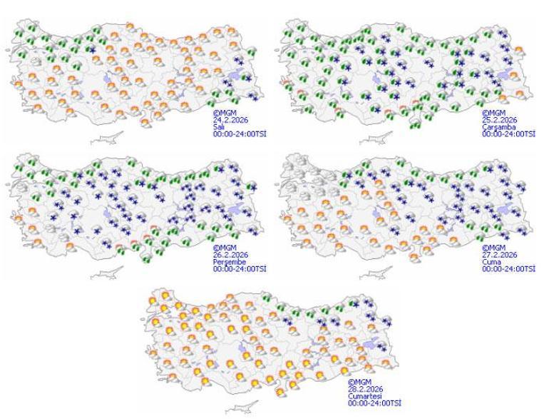 Meteoroloji Genel Müdürlüğü olarak yapılan kıymetlendirmelere göre: Ülkemiz genelinin parçalı ve mekan yer çeşitlilik bulutlu, Marmara, Kuzey Ege, İç Anadolu'nun kuzeyi, Batı Karadeniz, Doğu Anadolu'nun doğusu ile Çorum, Amasya, Batman ve Siirt çevrelerinin yağışlı geçeceği öngörü ediliyor. Yağışların, genelleme yağış ve sağanak, dahili ve yüksek kesimlerde karla karışık yağış ve kar yağışı yağışı şeklinde görüleceği öngörü ediliyor. Doğu Karadeniz’in dahili kesimlerinin yüksekleri ile Doğu Anadolu’nun doğusunda yüksek kar yağışı örtüsüne malik eğimli kesimlerinde çığ ve kar yağışı erimesi tehlikesi bulunmaktadır.