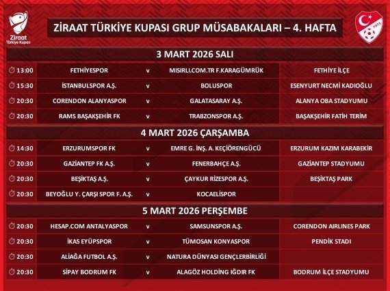 Ziraat Türkiye Kupası cemaat müsabakaları 4. hafta maçlarına ilişkin programlar açıklandı.